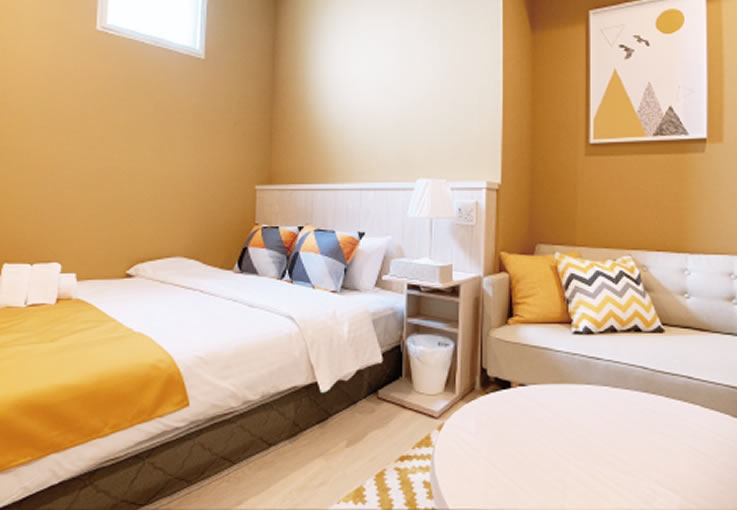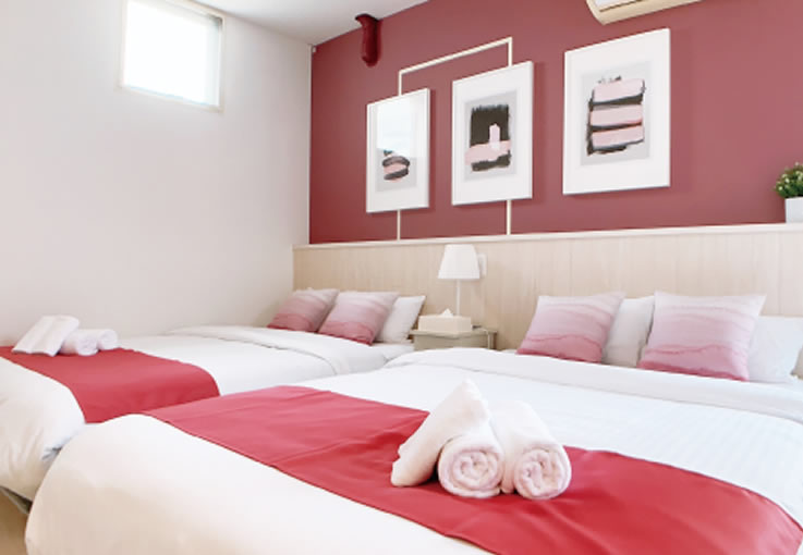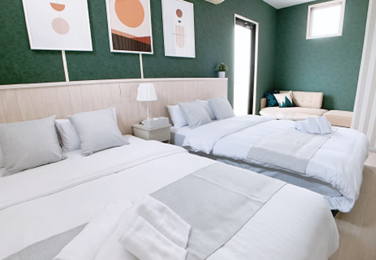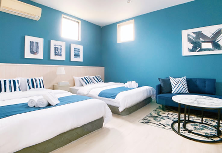 牡蠣の「黒」、廿日市市の花、桜の「ピンク」、鳥居の「朱色」、瀬戸内海の「ブルー」、 紅葉の「黄色」、宮島弥山の「グリーン」の6色を、それぞれお部屋のテーマにしています。