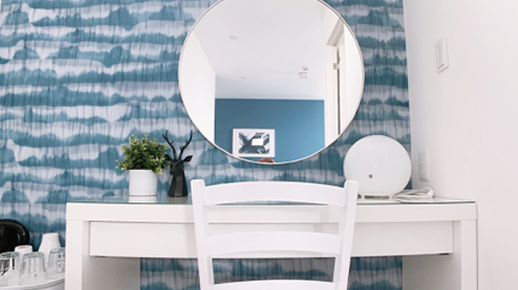 各お部屋には、メイクコーナーを完備しています。 大きな鏡とチェアがあり、ゆっくりとメイクや ヘアセットをしていただけます。